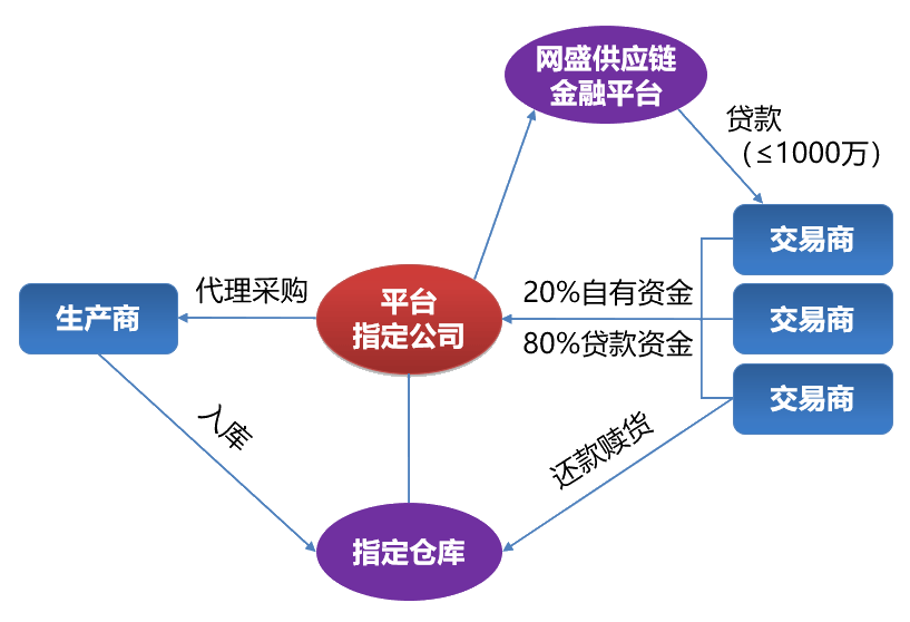 • 2 交易商将20%自有资金与80%贷款资金支付给平台指定公司,由平台指定公司为交易商向指定生产商代理采购,货物存放至指定仓库,并将货权质押给网盛融资。