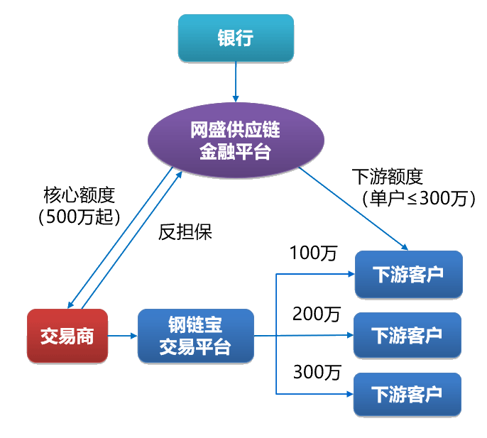 • 2 交易商联合网盛融资将额度切分给合格下游客户,买方获得银行贷款后用现金向交易商采购货物。