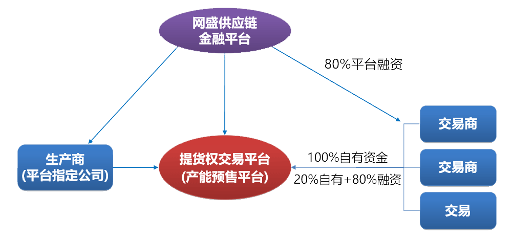 • 1 生产商(平台指定公司)通过提货权交易平台(产能预售平台)销售未来某一日期可以提货的商品,交易商可以用100%自有资金买入,也可以用20%自有资金+80%平台融资买入。
